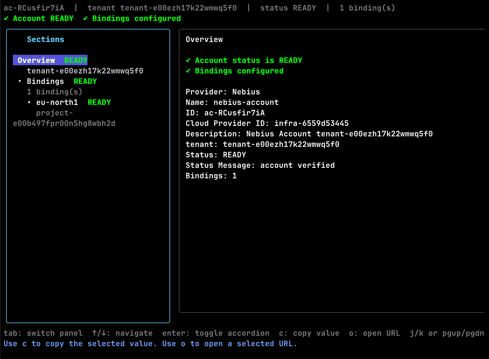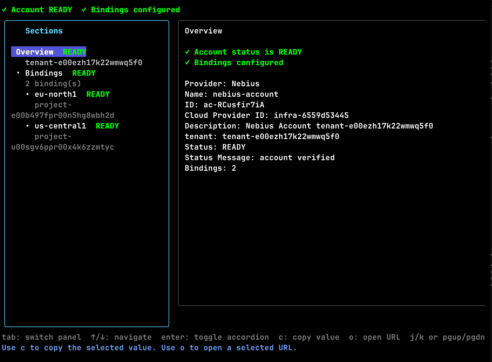 Use the JSON output if you want the backing accountConfigID and the raw Nebius binding verification details.
