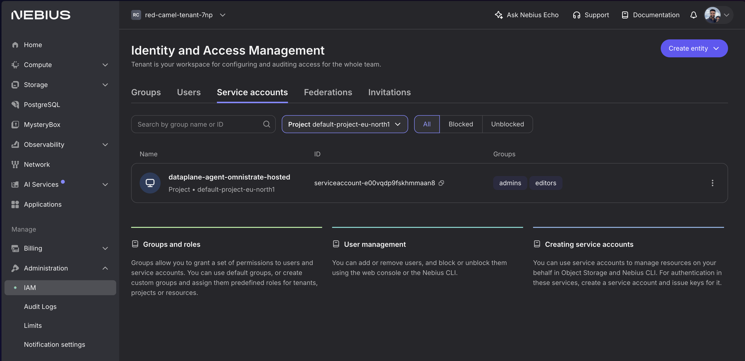 • A human operator with enough Nebius IAM access to create service accounts and service-account authorized keys.